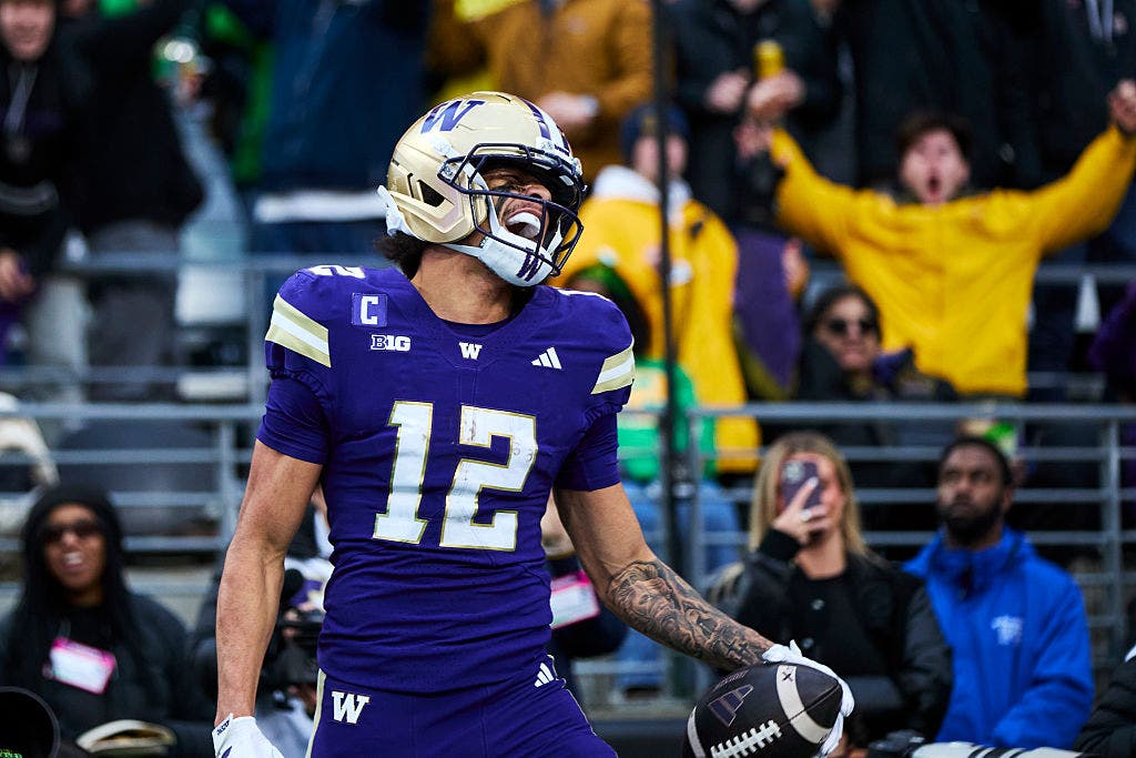 Denzel Boston celebrates after scoring a fourth-quarter touchdown against the Oregon Ducks at Husky Stadium in November. (Photo by Blake Dahlin/ISI Photos/ISI Photos via Getty Images)