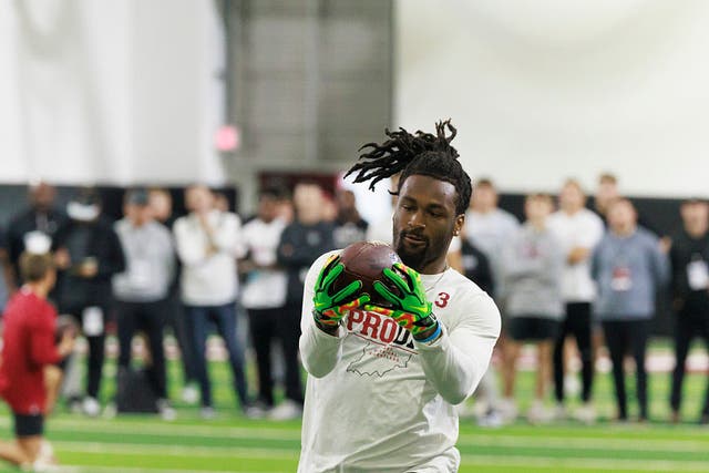 Indiana Hoosiers wide receiver Omar Cooper Jr. (3) catches a pass during NFL Pro Day. (Photo by Jeremy Hogan/SOPA Images/LightRocket via Getty Images)
