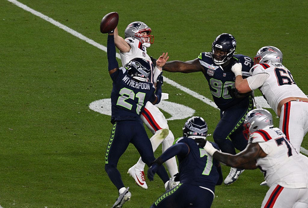 Seahawks corner Devon Witherspoon can not only cover the opponent's WR1, he was a nightmare for Patriots QB Drake Maye in the Super Bowl as a blitzer. (Photo by Focus on Sport/Getty Images)