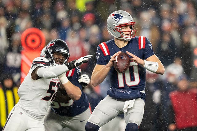 Will Anderson Jr. (51) closes in on Patriots QB Drake Maye during the playoffs last season. (Photo by Michael Owens/Getty Images)