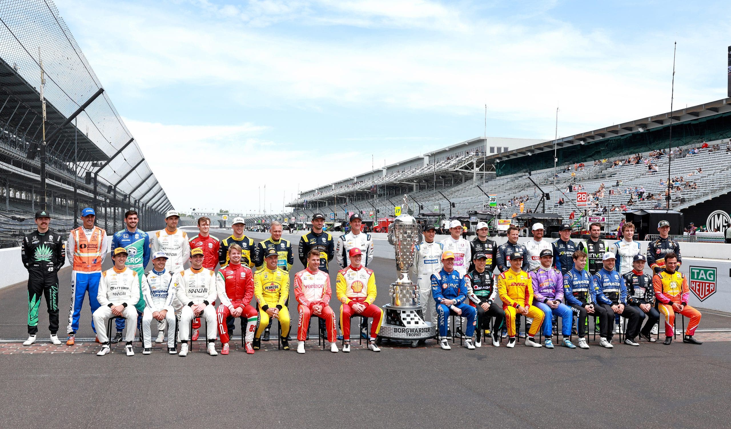 All 33 INDYCAR drivers pose on the yard of bricks before the 109th running of the Indianapolis 500 in 2025.