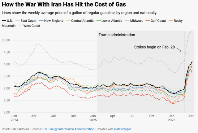 But the view is much different beneath the service station signs across the country that have flipped to more than $4 per gallon for the first time in four years. Over the past month, US households paid $8.4 billion more for gasoline compared to prices before the war on Iran began, according to a report by Democrats on Congress’ Joint Economic Committee.