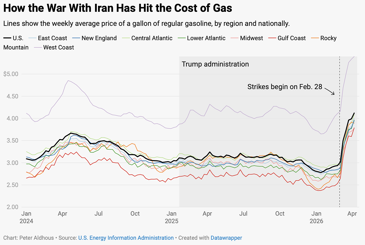 Drivers on the West Coast have seen the worst price jumps in the United States, with the average price of a gallon of regular gasoline reaching $5.40 per gallon at the start of this week, about 30 percent higher than the US average. That is largely because the most-populous state is not connected to other US supply centers by pipelines and its refineries rely heavily on imports. It’s one of the details that Trump overlooked when he said the US doesn’t need oil from the Strait of Hormuz, Gordon said. “A lot of this depends on infrastructure and geography.”