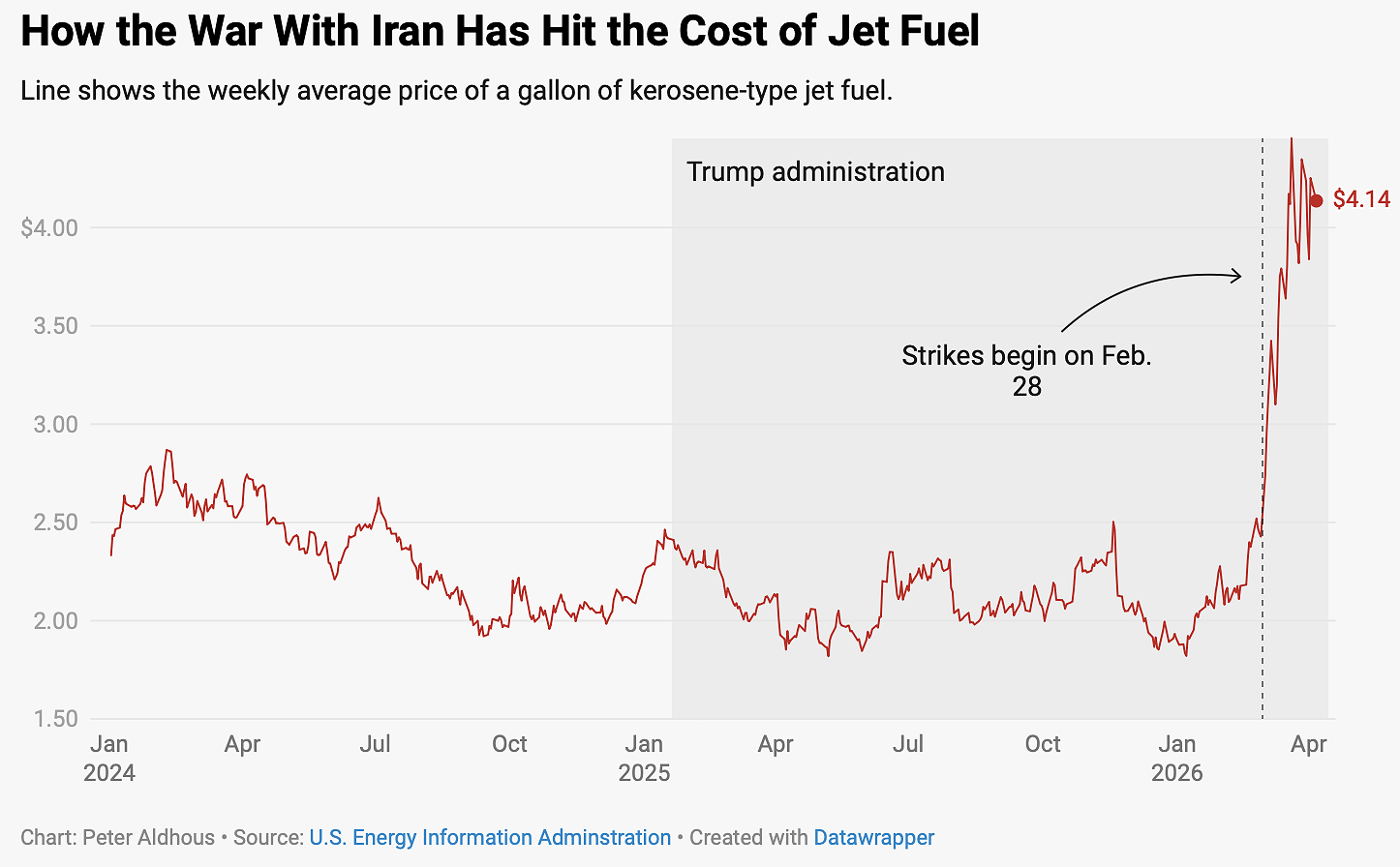 Gasoline prices were up about 40 percent since the start of the war, but other petroleum fuels saw more dramatic run-ups, according to EIA data. Diesel fuel was up close to 50 percent—adding to trucking costs, which get passed along to consumers in higher prices for food and goods. Jet fuel was up 65 percent, according to EIA. United Airlines CEO Scott Kirby told his employees in an open memo that if prices stayed at this level, the company would face $11 billion in additional jet fuel costs this year—or more than triple the company’s 2025 profit of $3.35 billion. United is cutting unprofitable flights, expecting to reduce passenger capacity by 5 percent through summer.